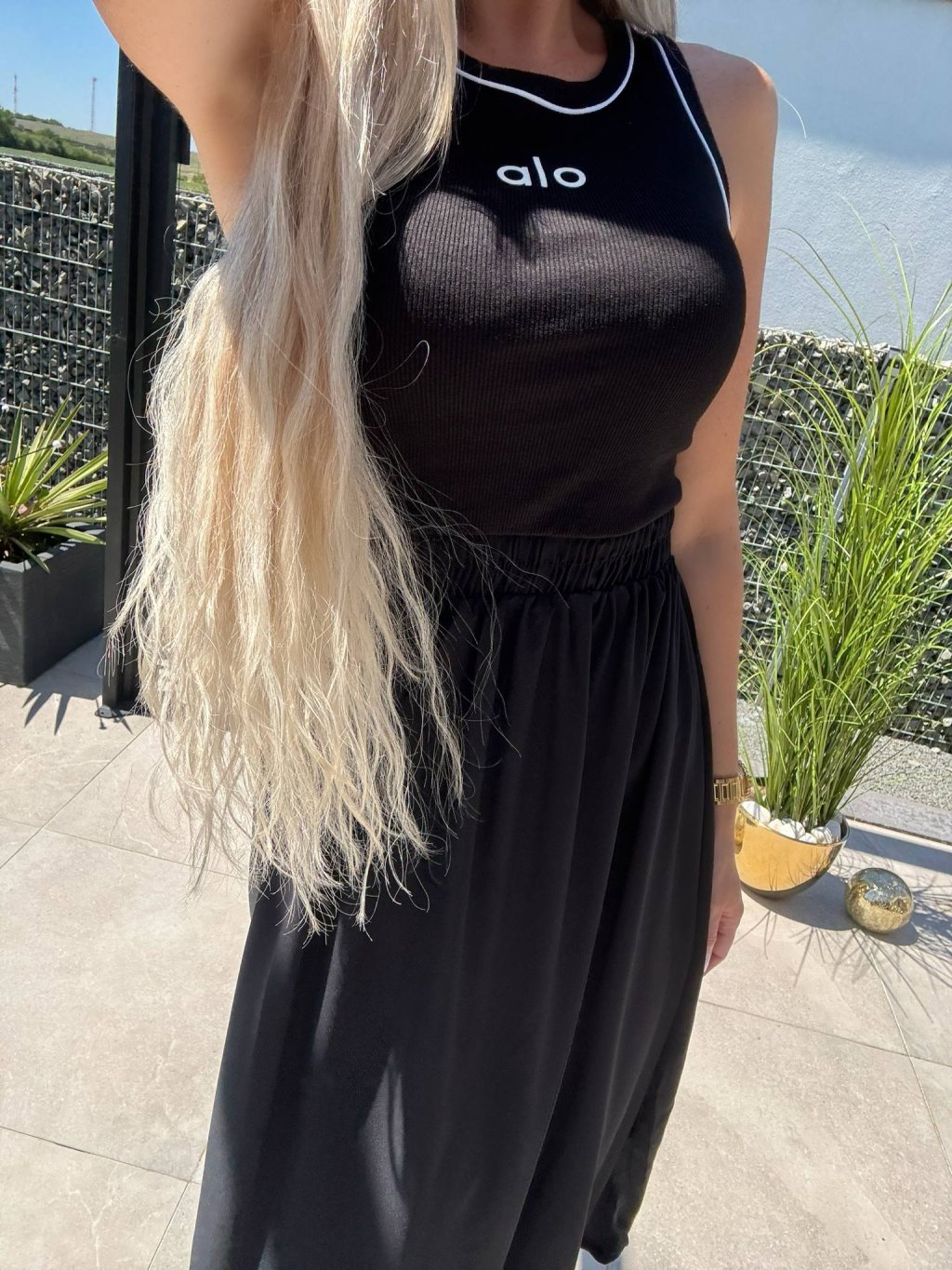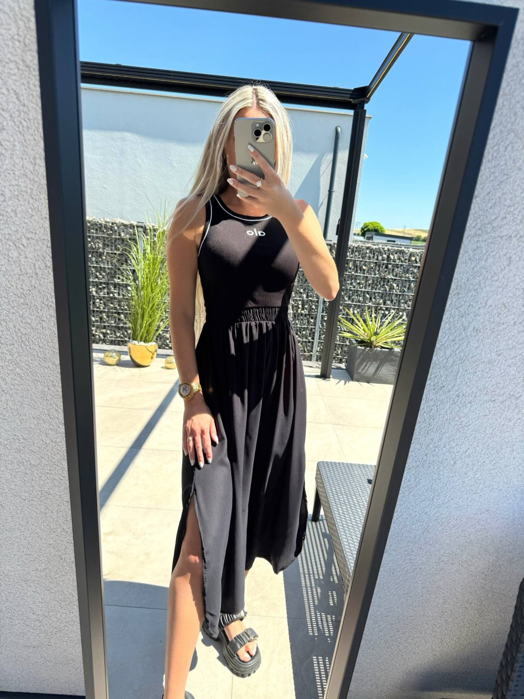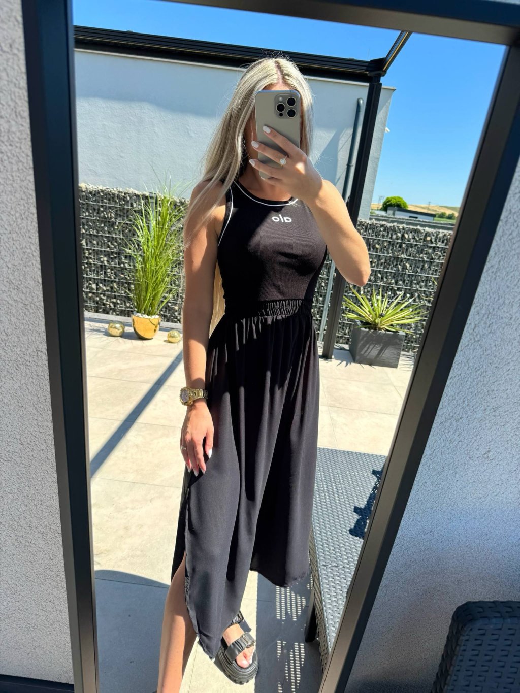 Vrchná časť šiat je z vrúbkovaného pevnejšieho sťahujúceho materiálu, spodná časť je z materiálu z akého sú naše ALo style vzdušné nohavice. Majú 2 rozparky. Velkosti sú strihovo užšie - velkosť S sedí na XS. Odporúčam objednávať o číslo väčšie.