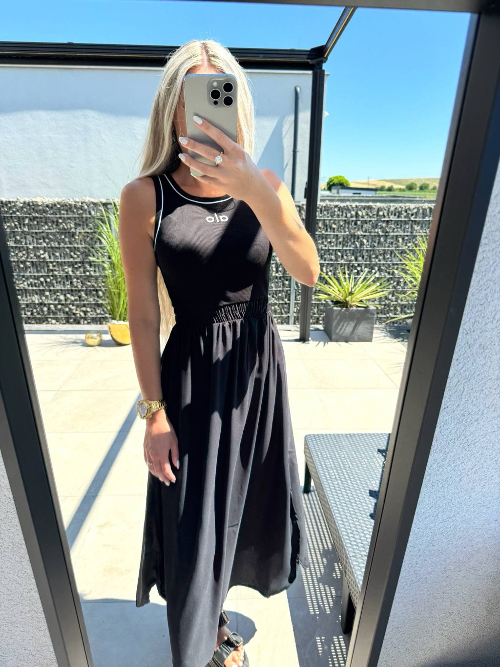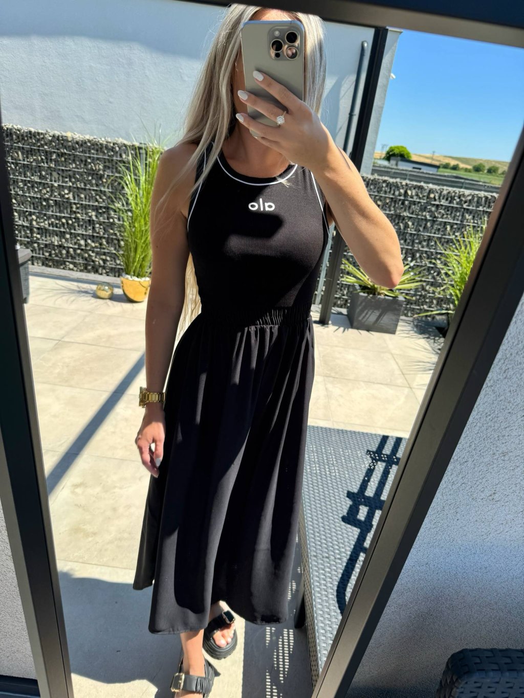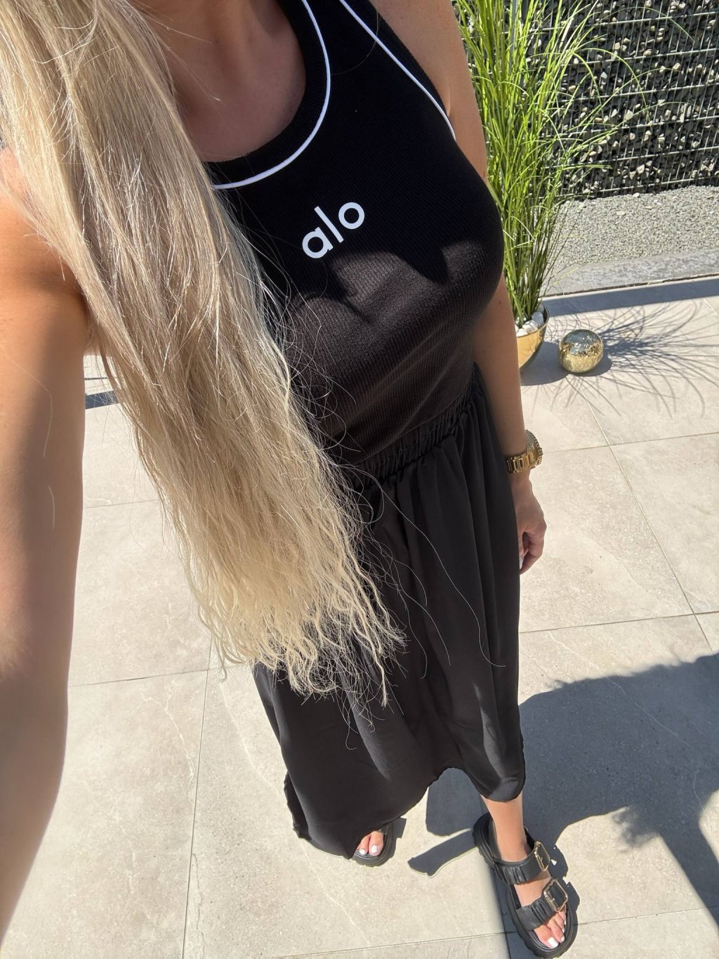 Vrchná časť šiat je z vrúbkovaného pevnejšieho sťahujúceho materiálu, spodná časť je z materiálu z akého sú naše ALo style vzdušné nohavice. Majú 2 rozparky. Velkosti sú strihovo užšie - velkosť S sedí na XS. Odporúčam objednávať o číslo väčšie.