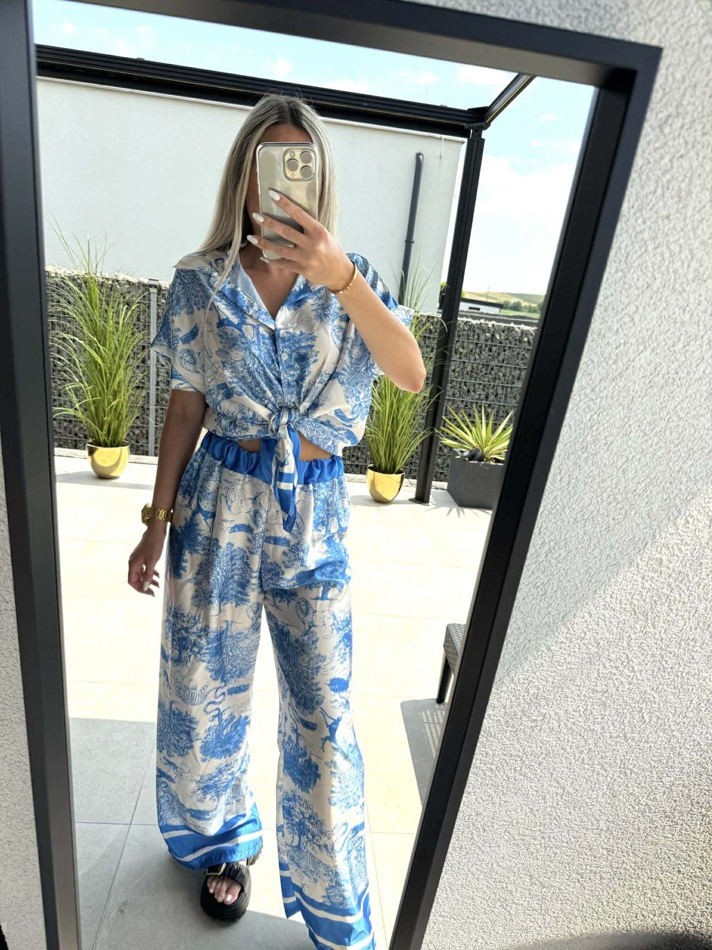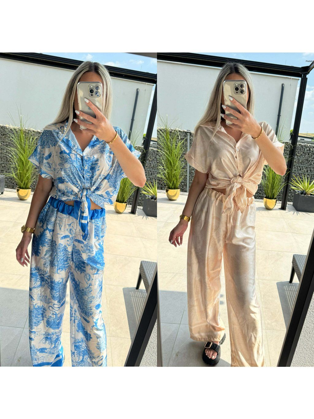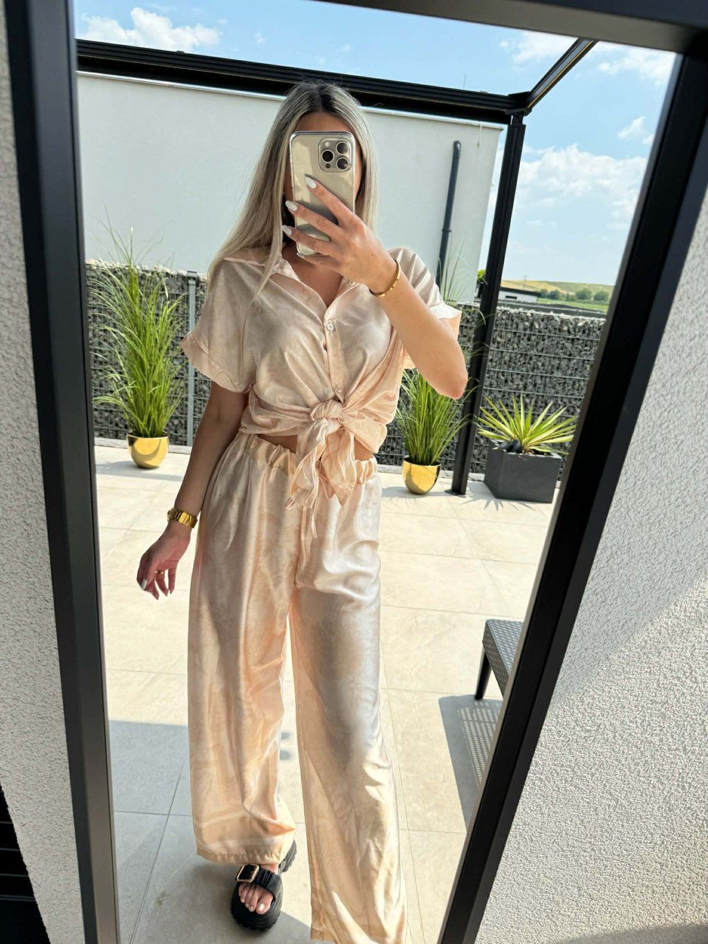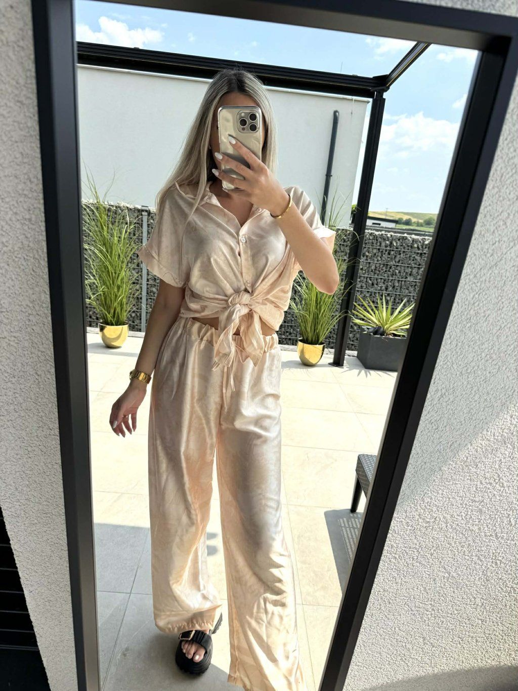 Luxusný saténový materiál s odleskami. Košela + nohavice v páse na gumičku, celková dlžka 105cm. Velkosť UNI - sedí na XS S M menšie L.