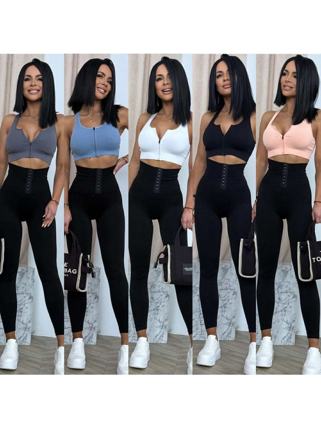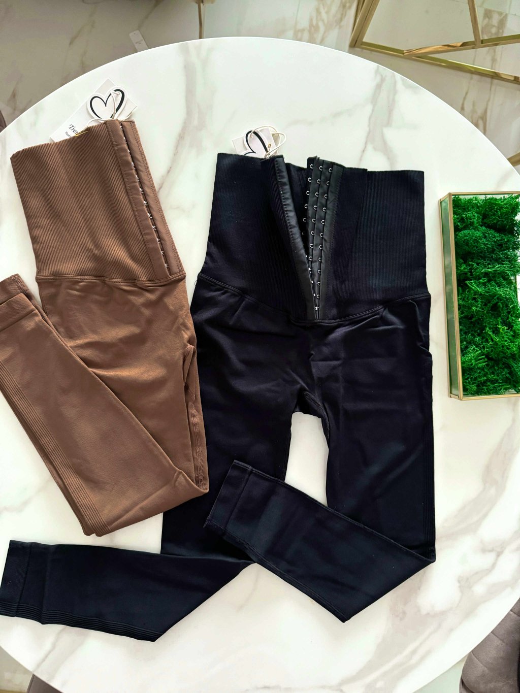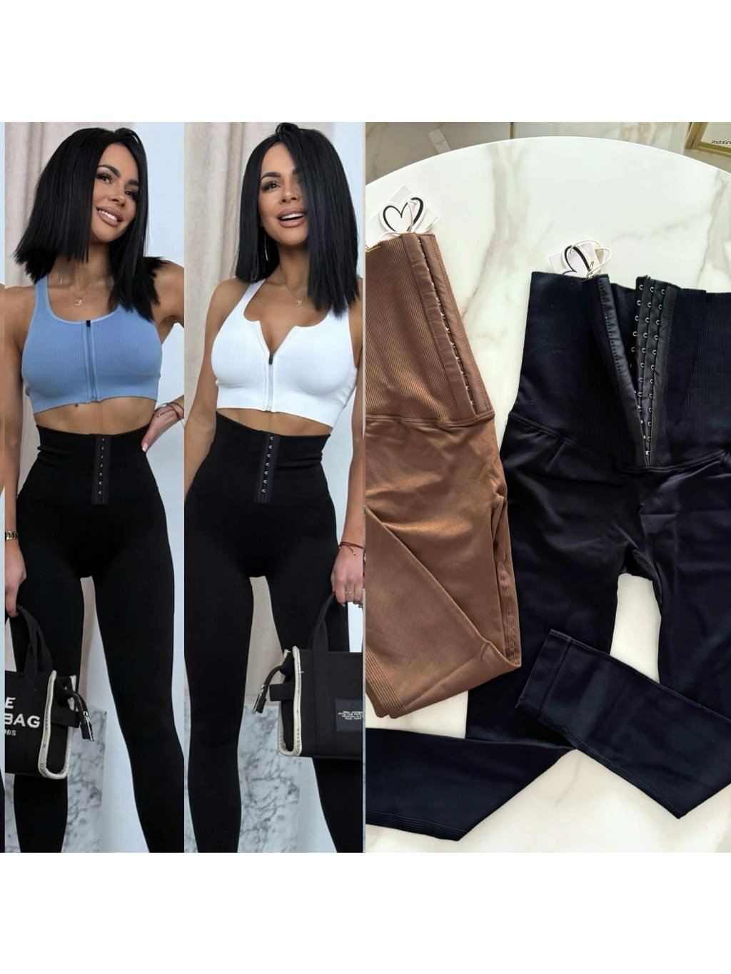 Sťahujúce legíny so zapínaním na háčiky, vďaka hrubšiemu pásu stiahnu bruško a vytvarujú postavu, vysoký pás, velkosť S/M je užšia sedí na XS/S a velkosť M/L sedí na S/M.