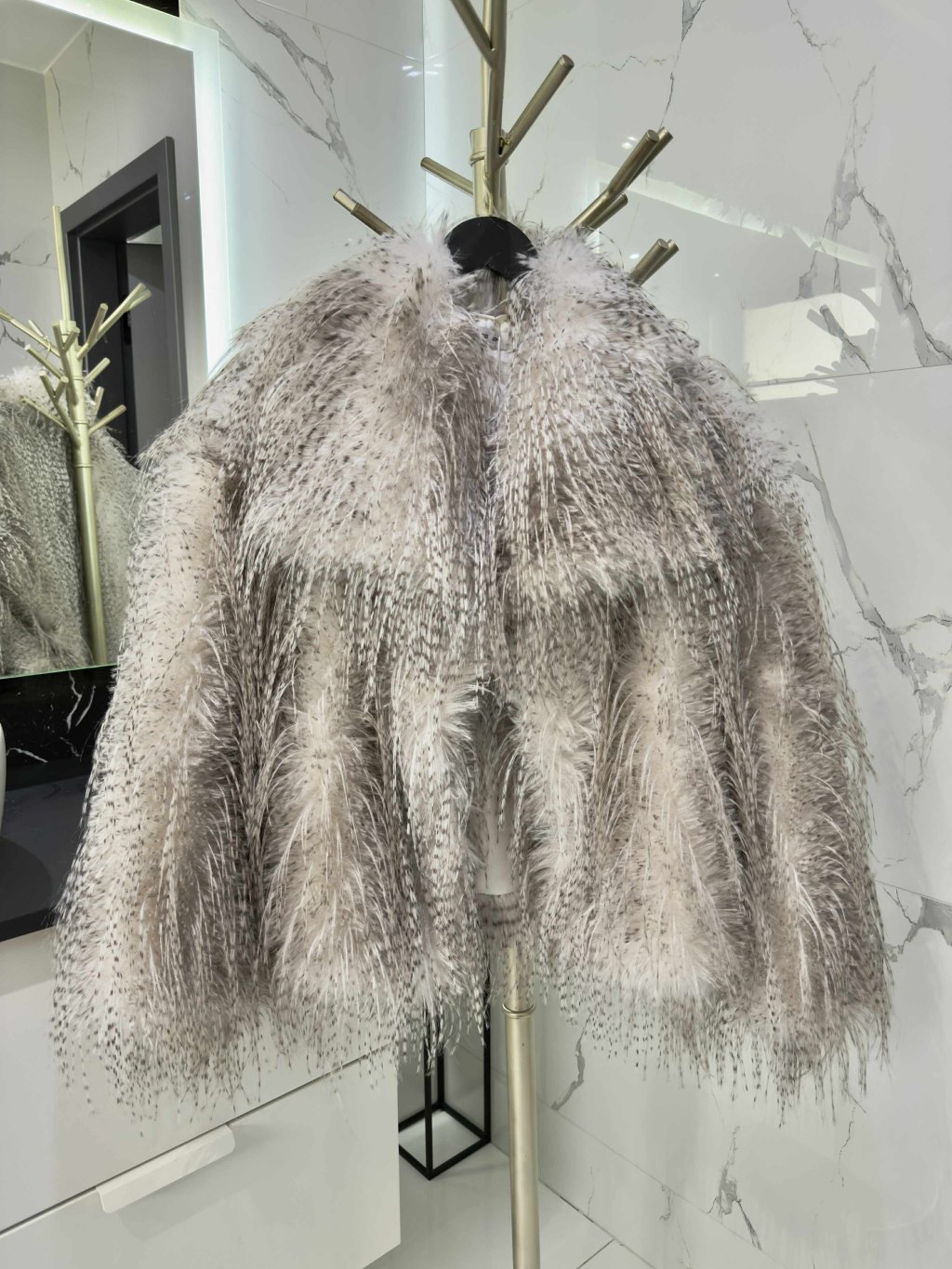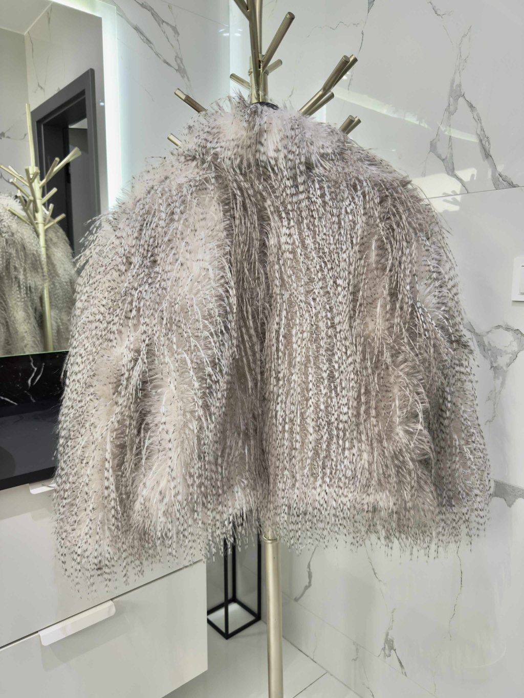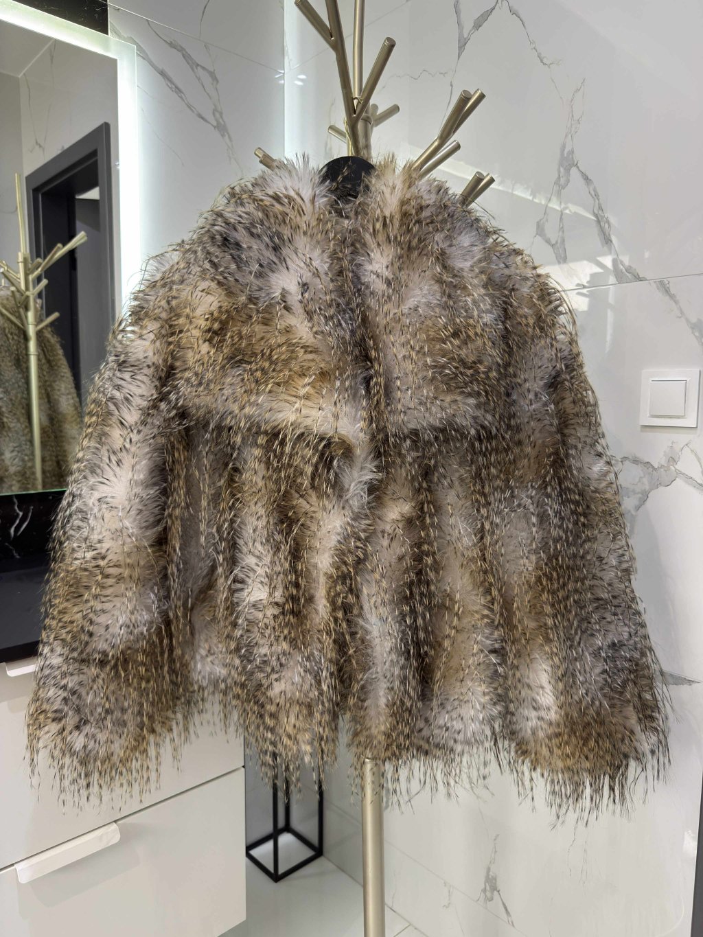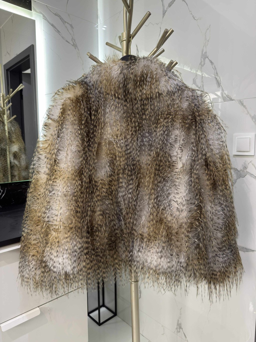 Luxusná umelá kožušina s efektom prepelice. Mäkký, hustý materiál s prirodzenou textúrou a jemným leskom. Vyrobené z vysoko kvalitných syntetických vlákien. Vzhľad pravej kožušiny. Zapínanie na 2 gombíky, ma vrecká. Velkosť UNI - sedí na XS S M L.