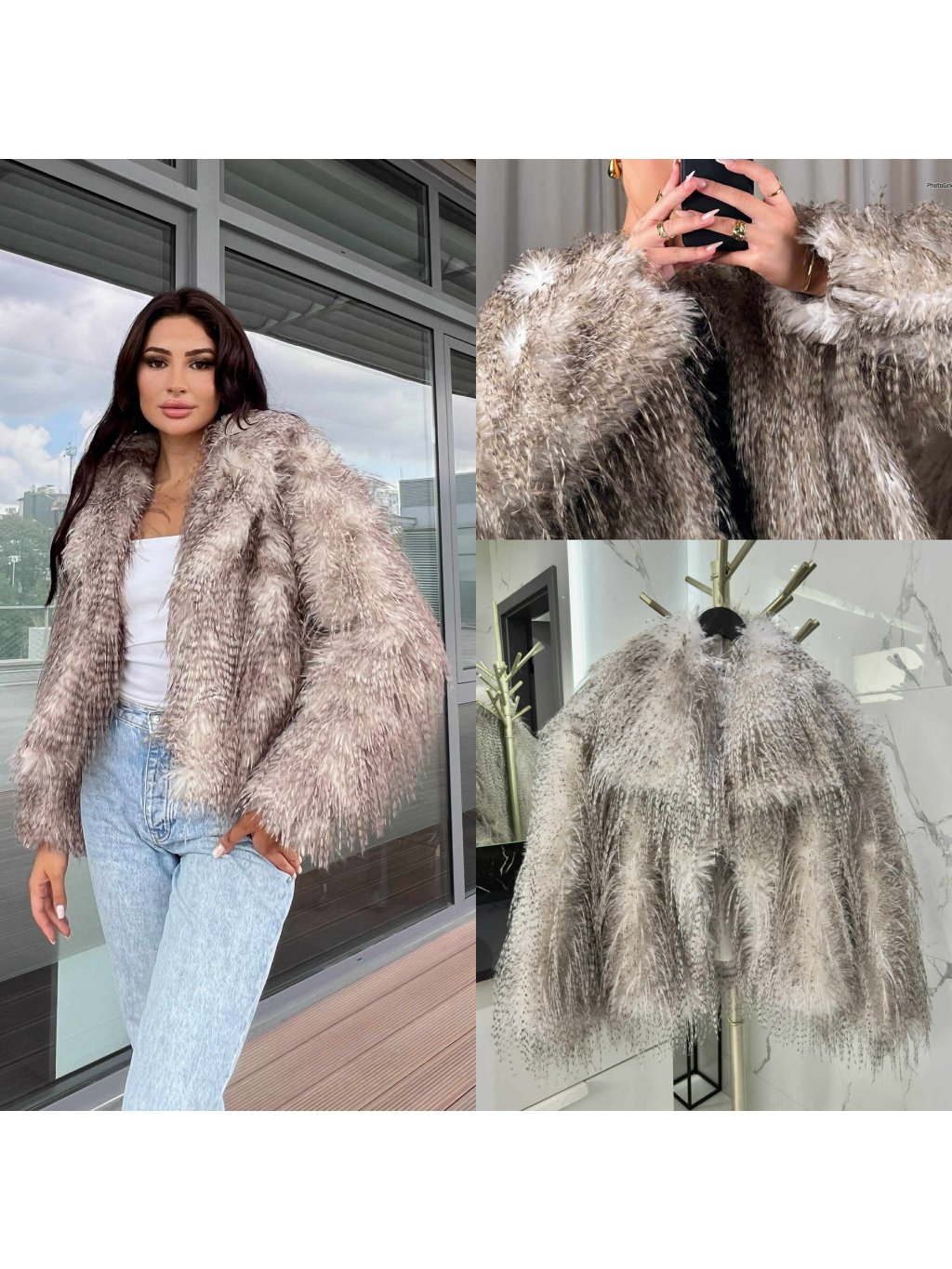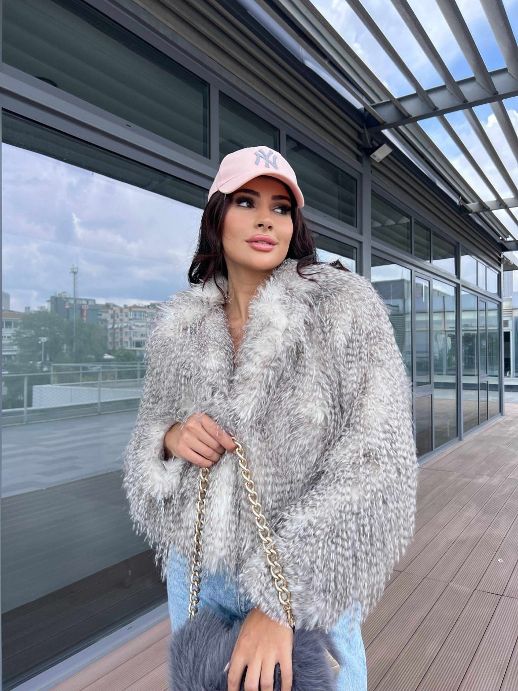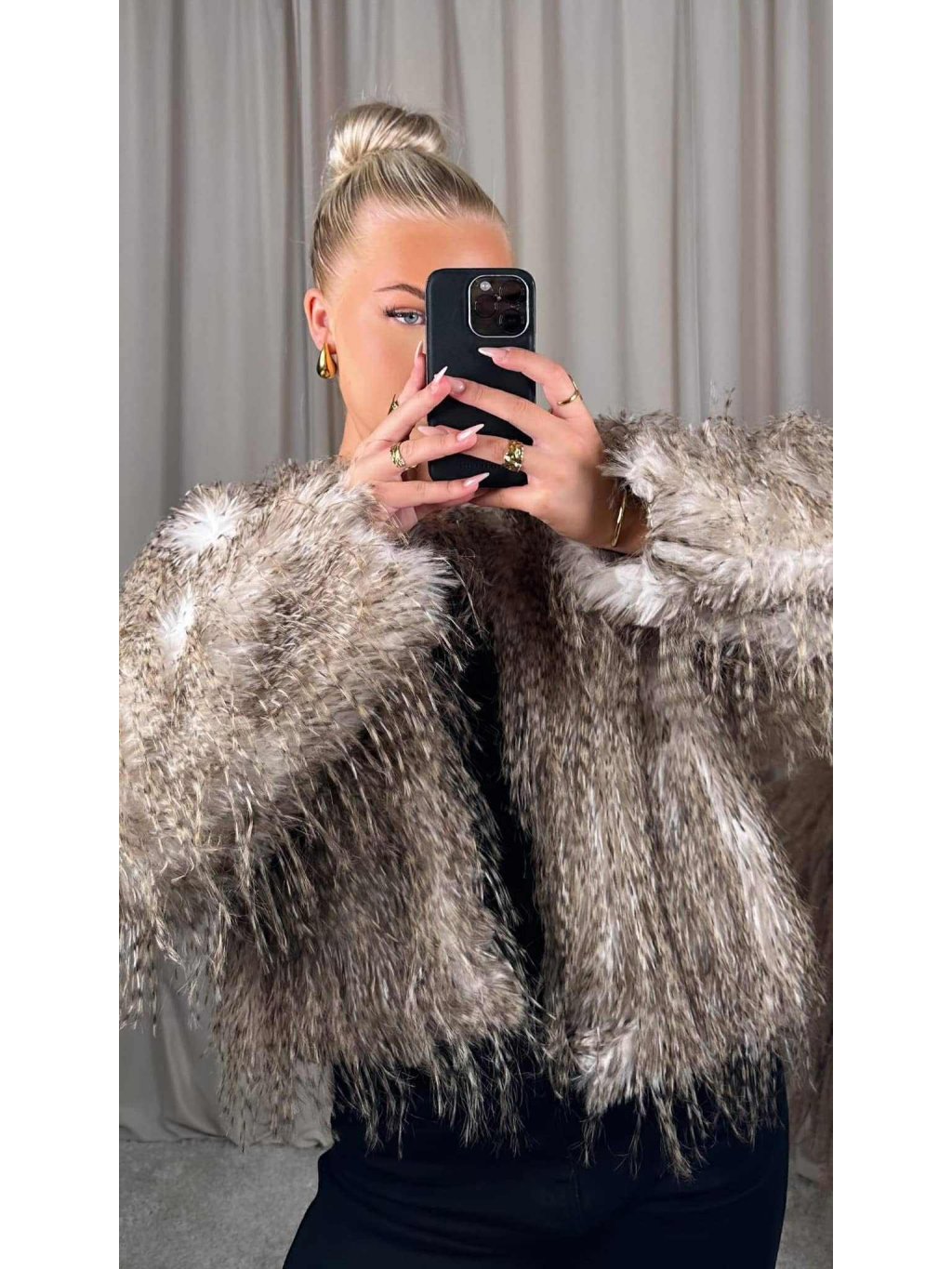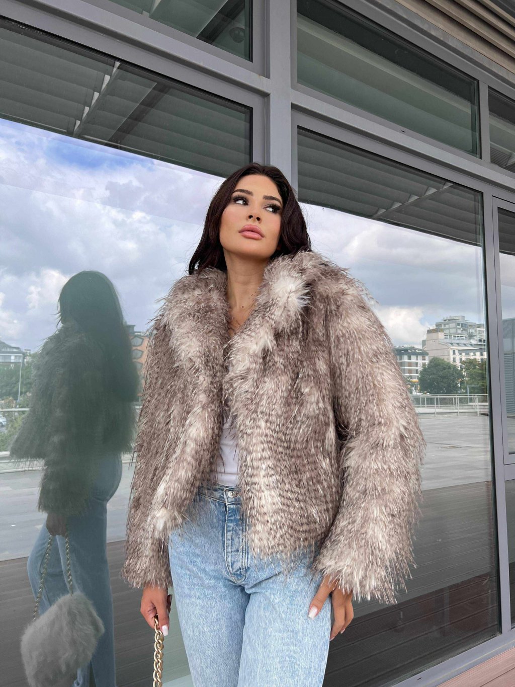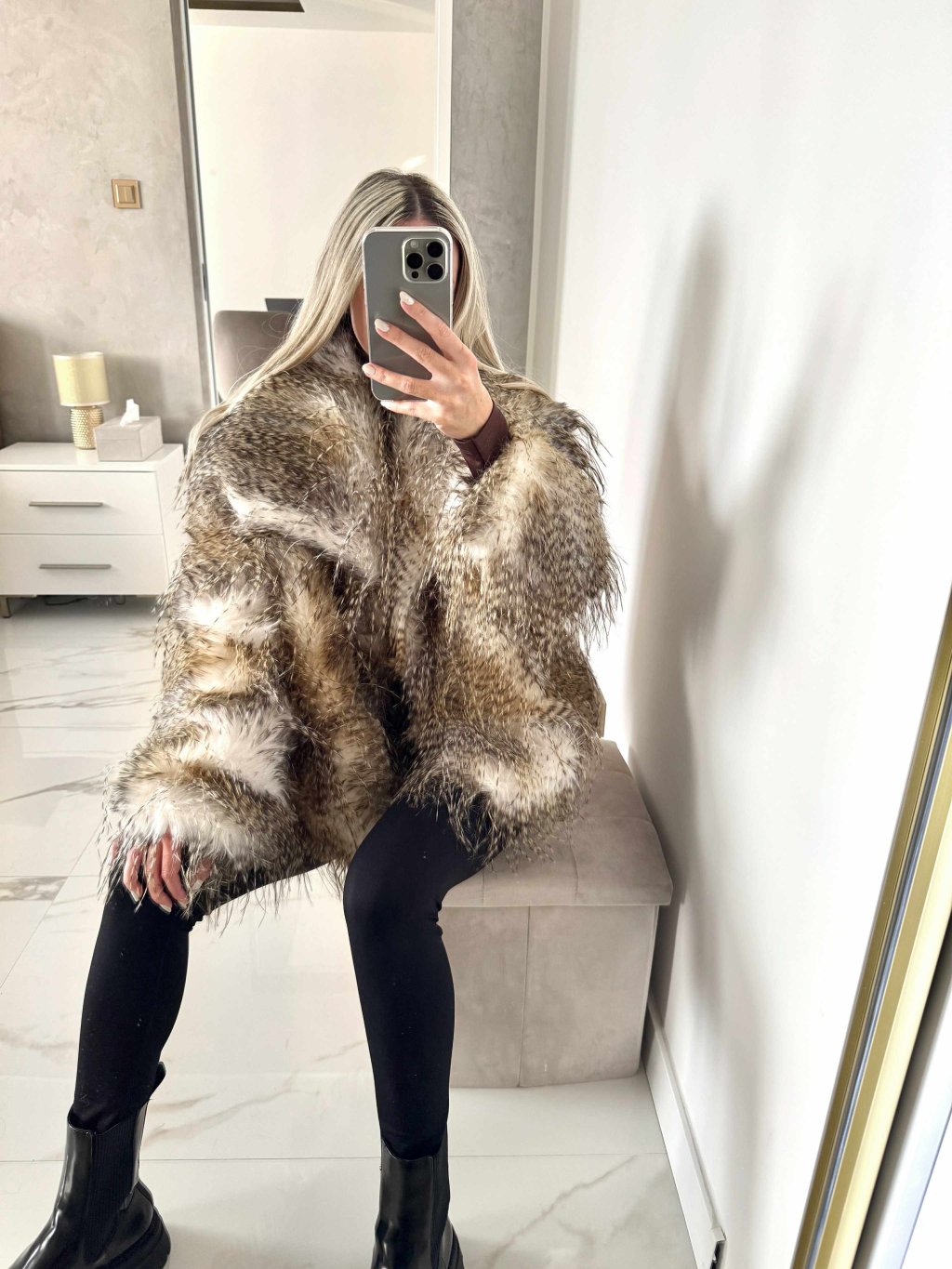 Luxusná umelá kožušina s efektom prepelice. Mäkký, hustý materiál s prirodzenou textúrou a jemným leskom. Vyrobené z vysoko kvalitných syntetických vlákien. Vzhľad pravej kožušiny. Zapínanie na 2 gombíky, ma vrecká. Velkosť UNI - sedí na XS S M L.