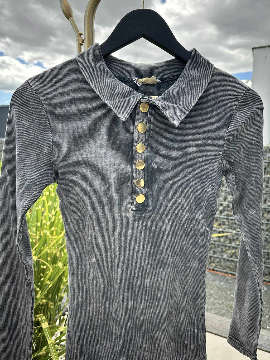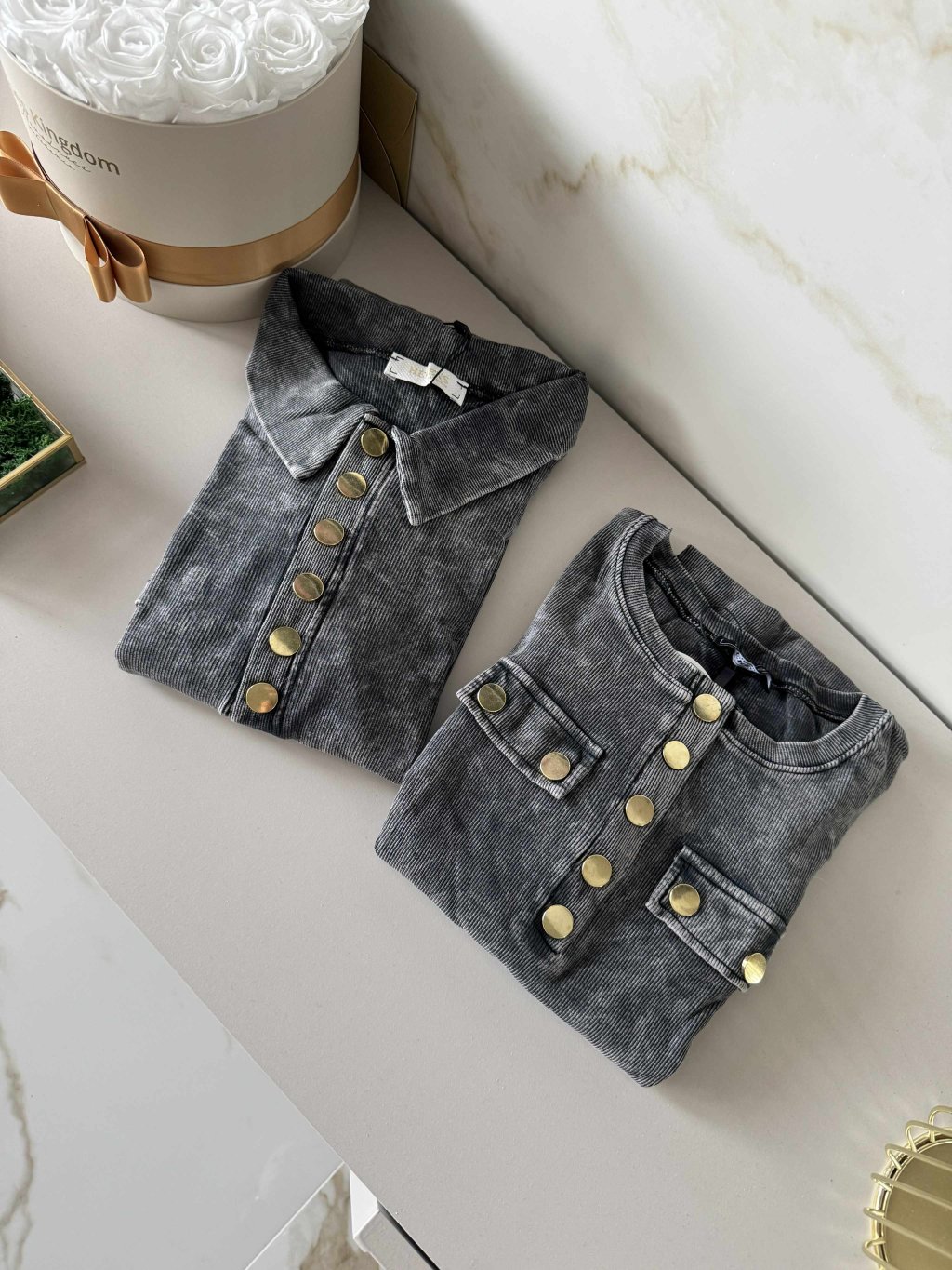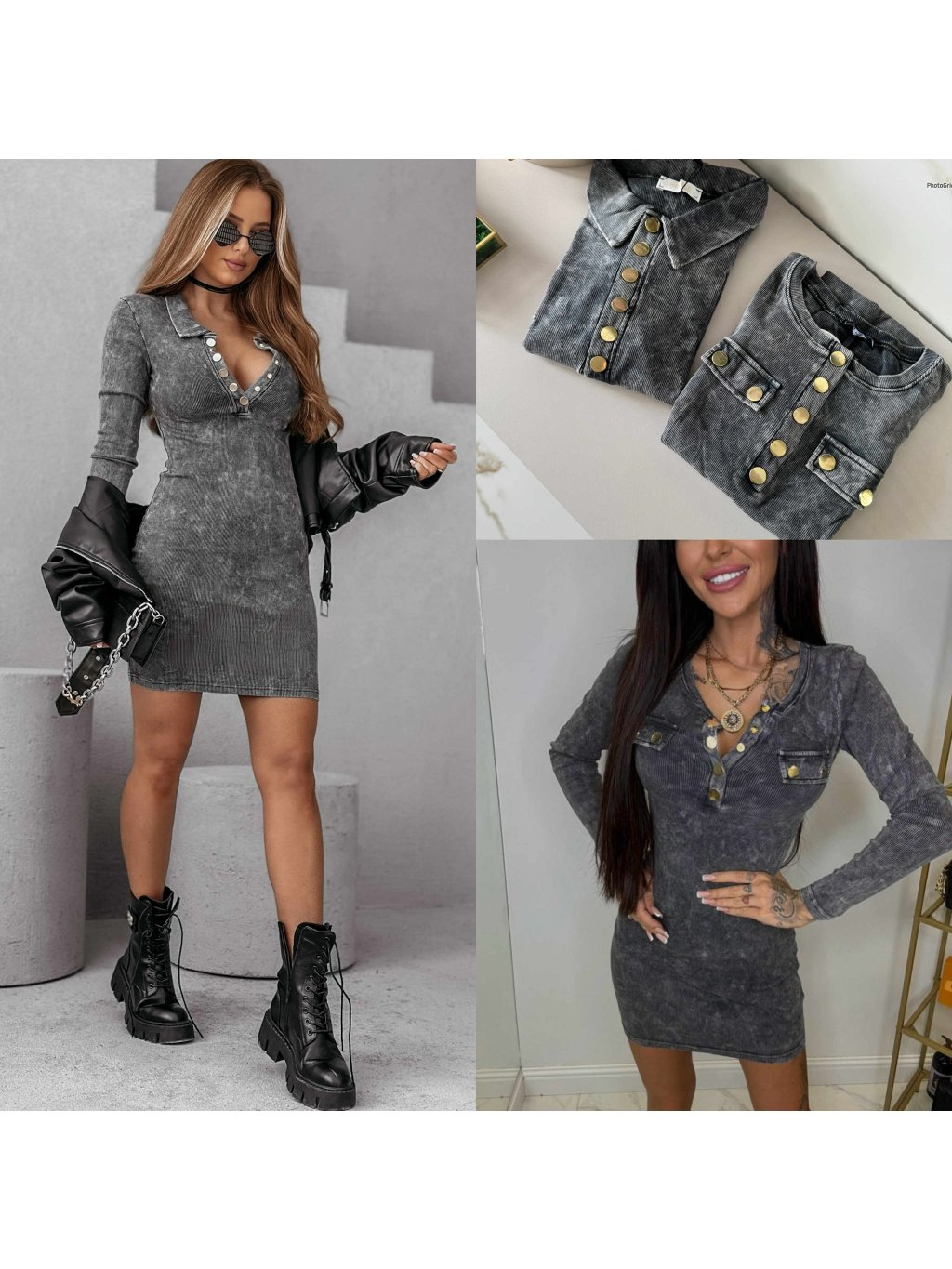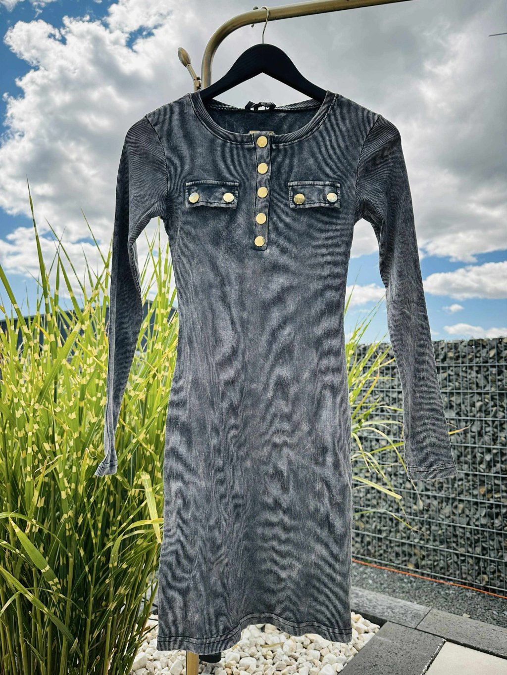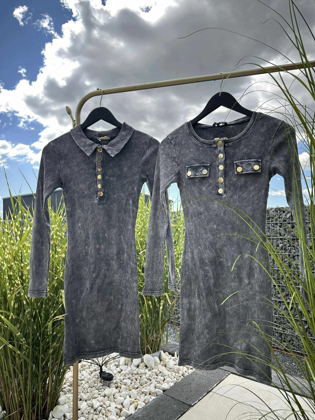 Elastické šaty z vrúbkovaného materiálu so zlatými gombíkmi. Skladom sú 2 druhy - 1. model sú šaty s golierom a 2- model sú šaty s vreckami na prsiach. Velkosť UNI - sedia na XS S M.