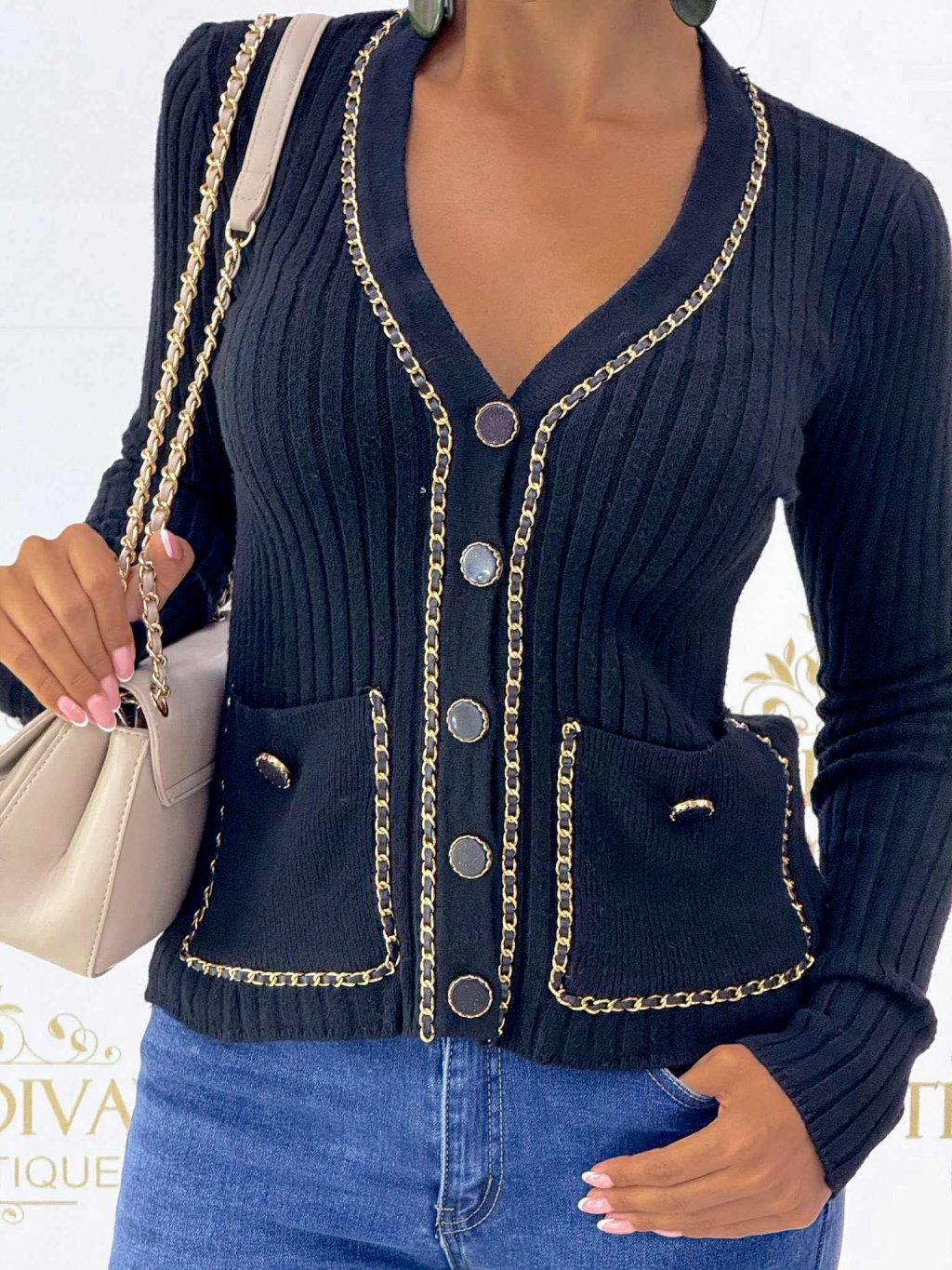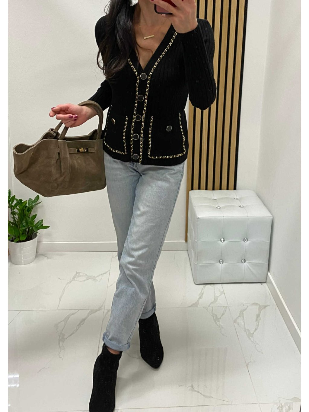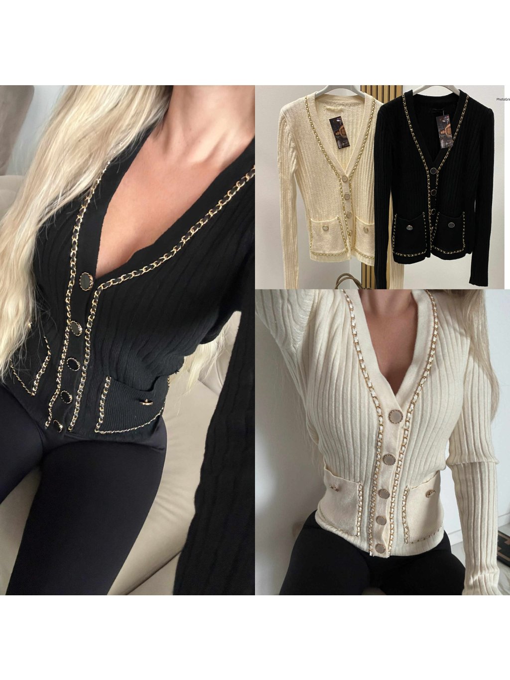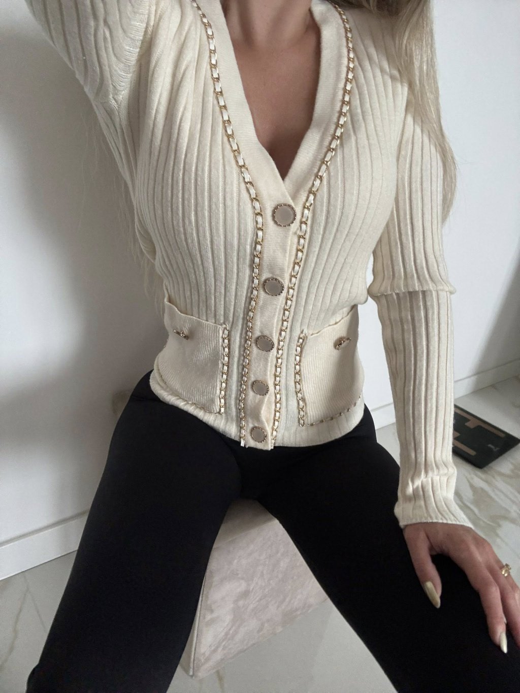 Úpletový svetrík so zlatými detailami, veľmi príjemný elastický materiál. Velkosť UNI - sedí na XS S M.