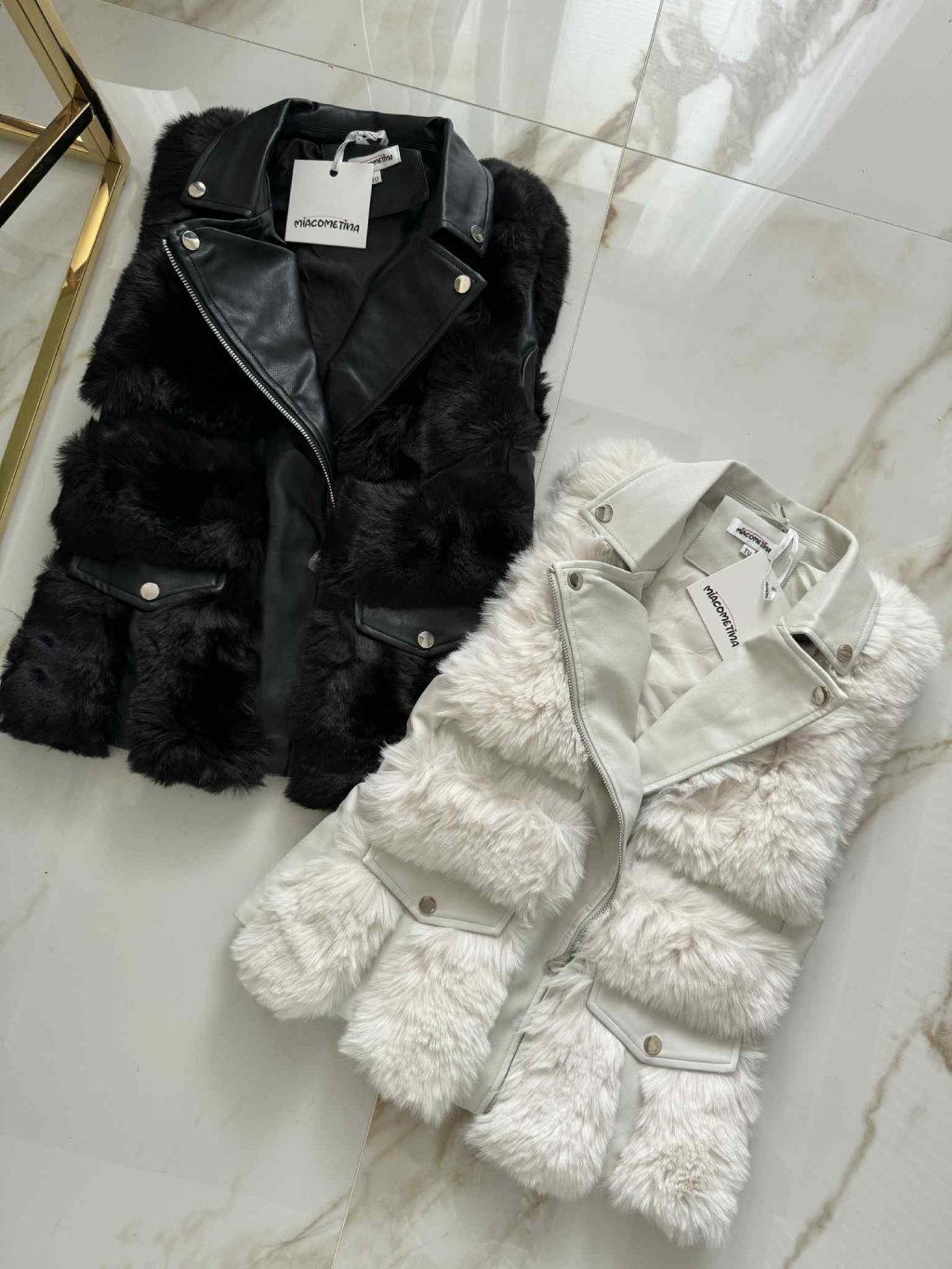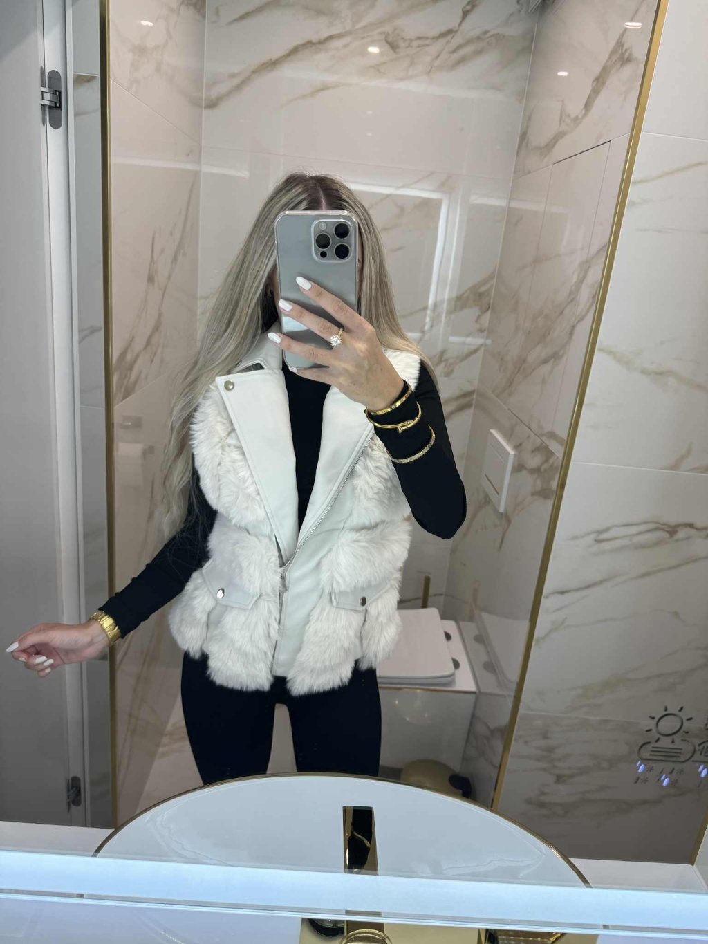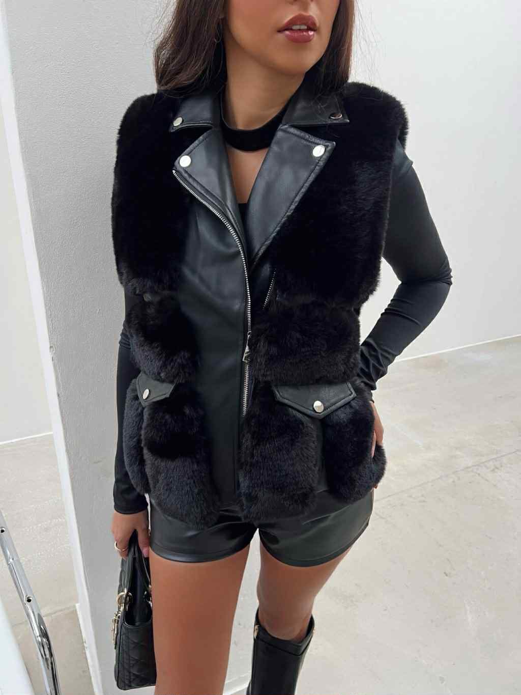 Luxusná koženkovo - kožušinová vesta. Strieborné aplikácie, vesta vyzerá skvelo zapnutá aj rozopnutá. Velkosť UNI - sedí na S M menšie L.
