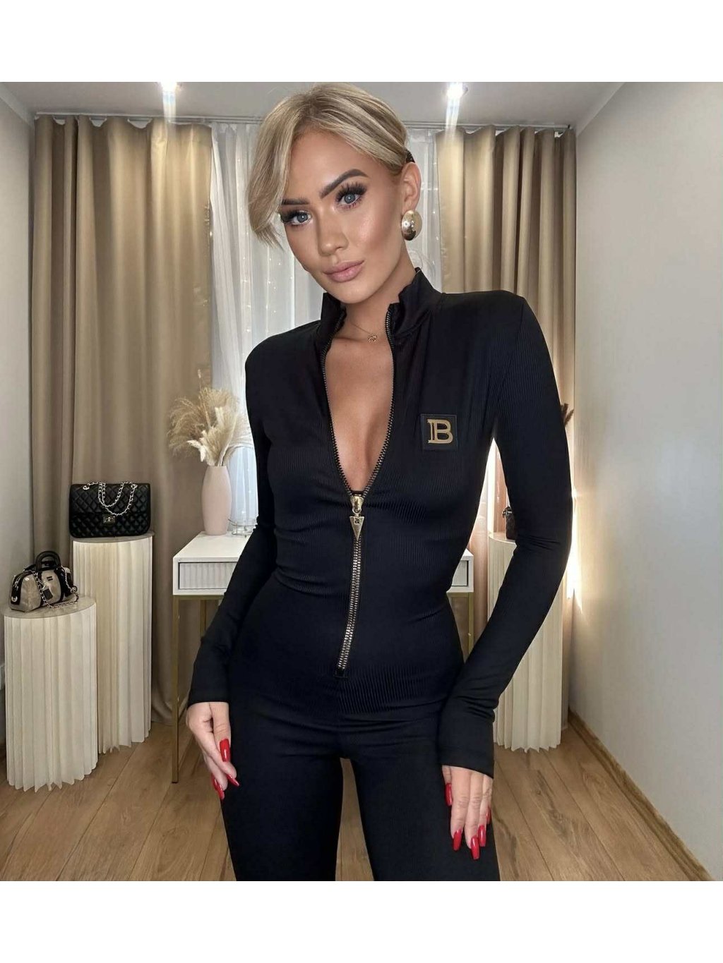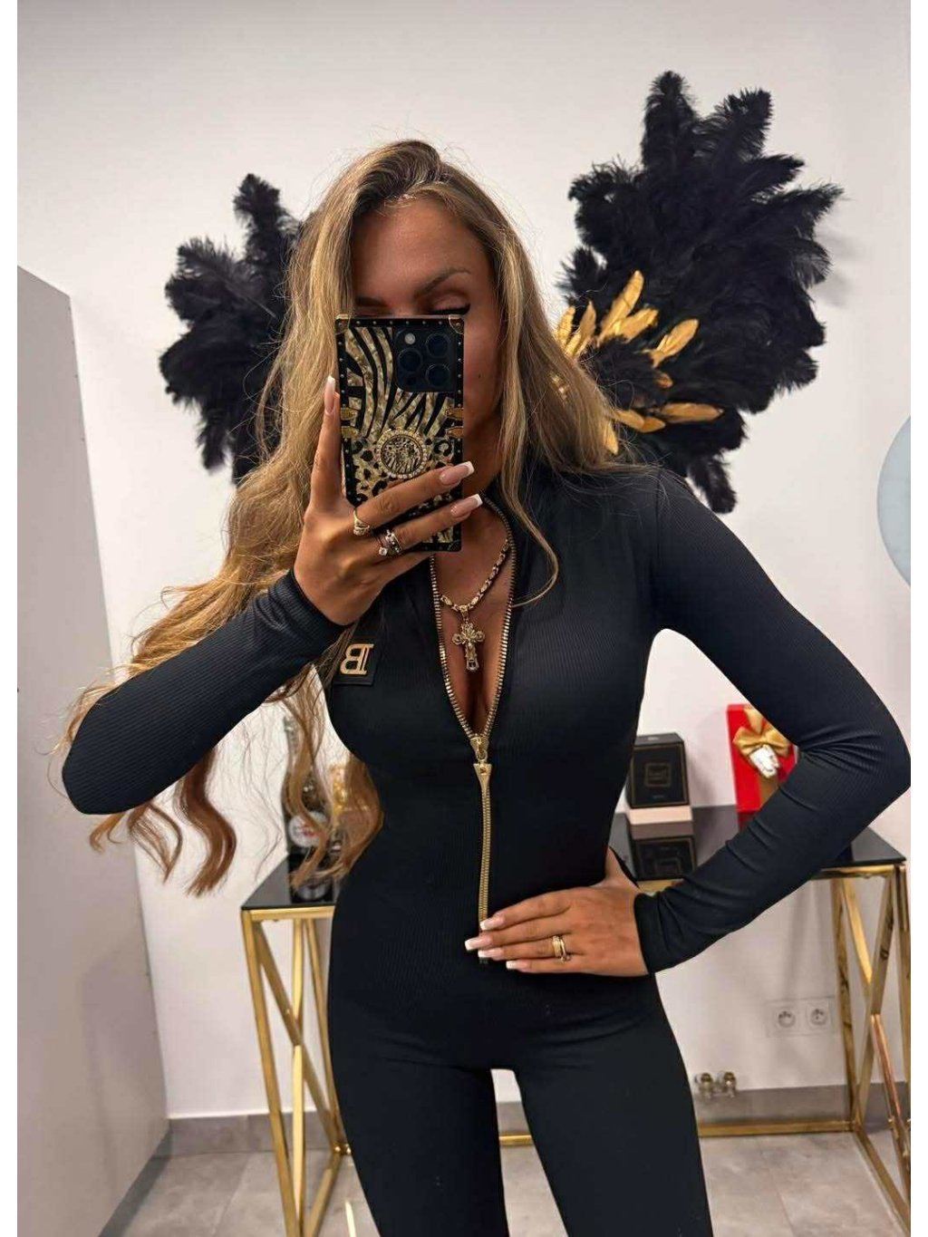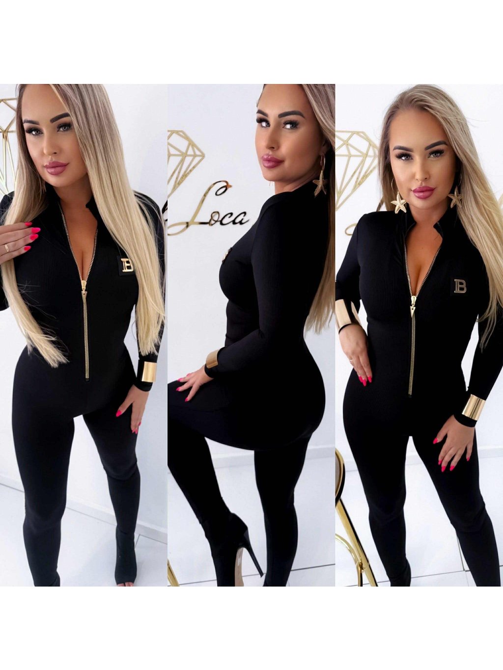 Elastický vrúbkovaný mierne sťahujúci overal so zlatým zipsom a nášivkou B. Výborne sedí na postave.