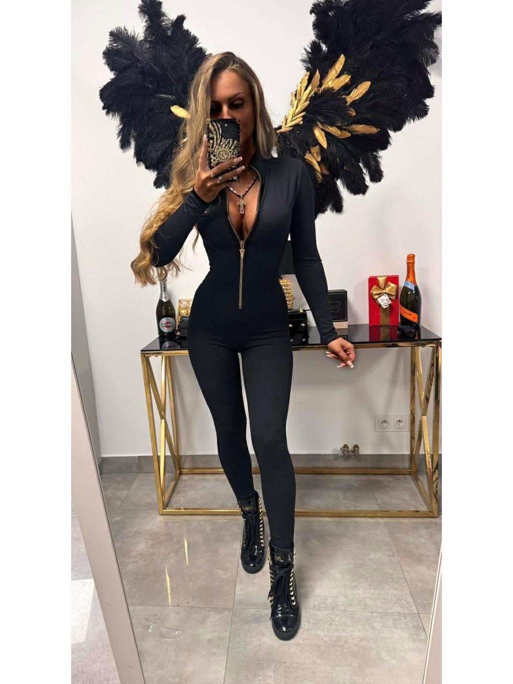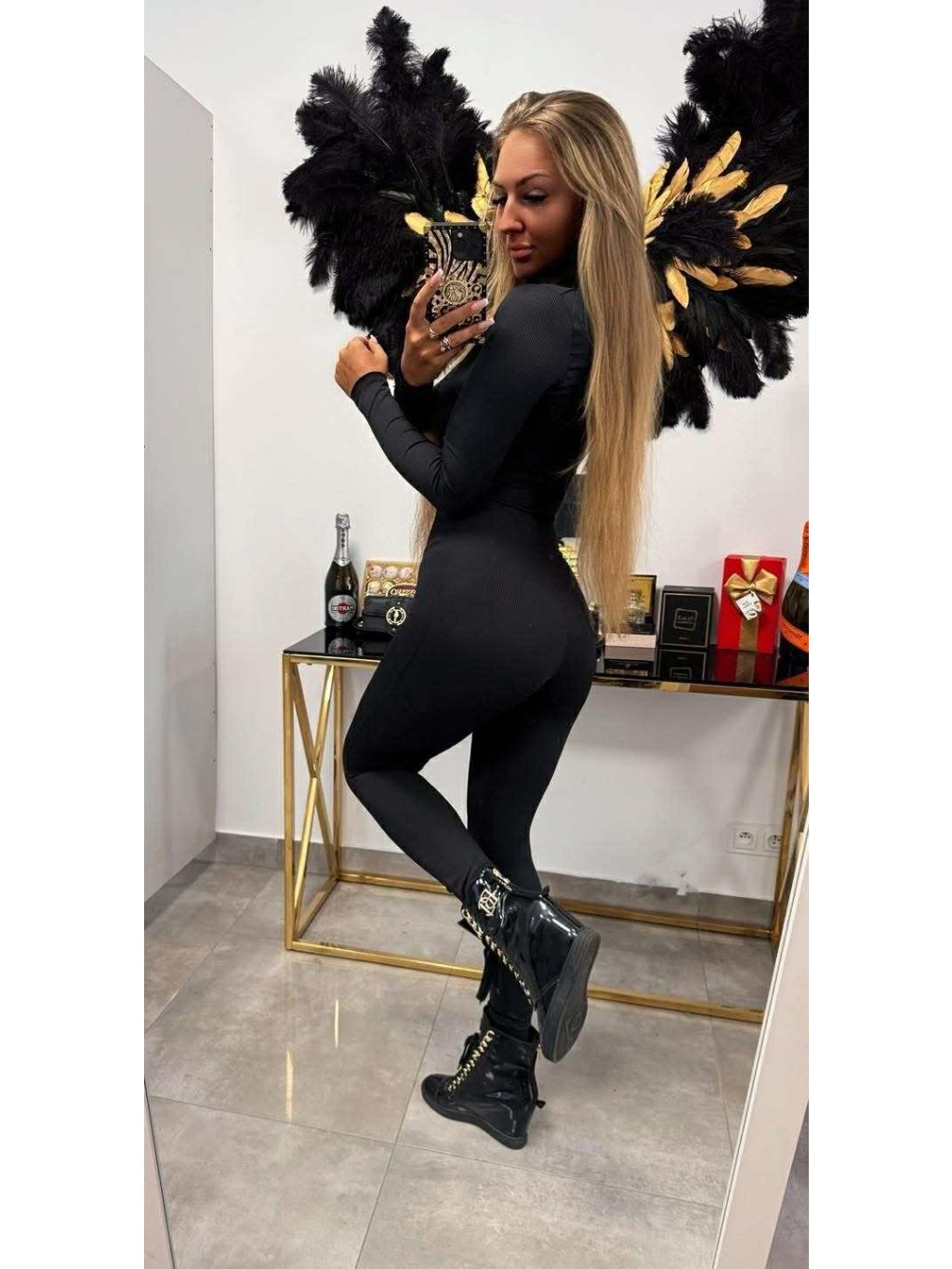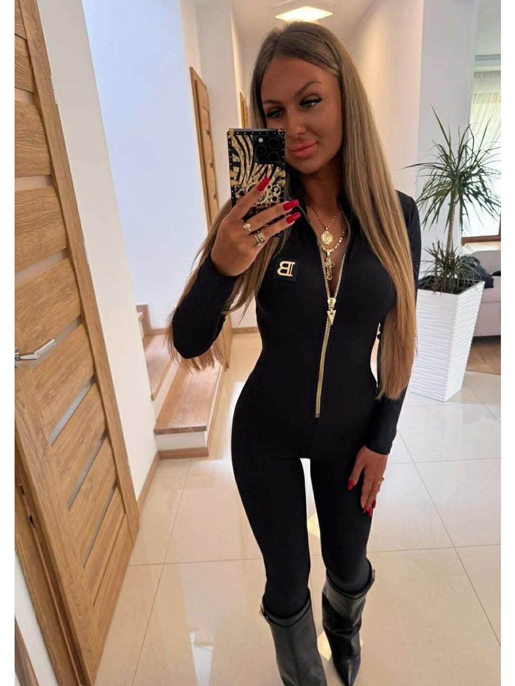 Elastický vrúbkovaný mierne sťahujúci overal so zlatým zipsom a nášivkou B. Výborne sedí na postave.